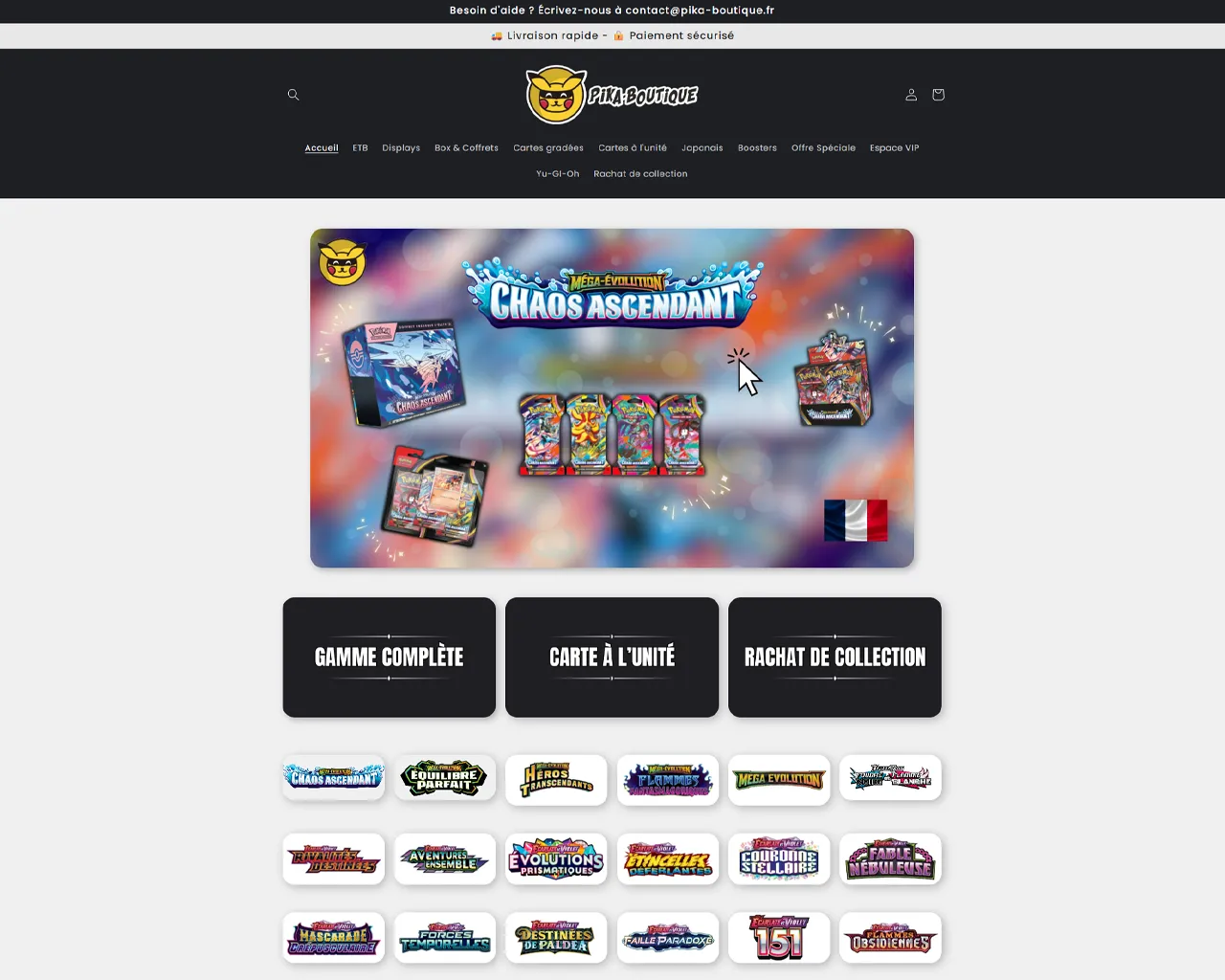 Pika-boutique est une boutique de displays, coffrets et cartes Pokémon à collectionner !